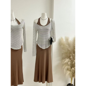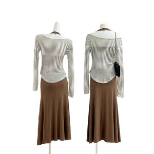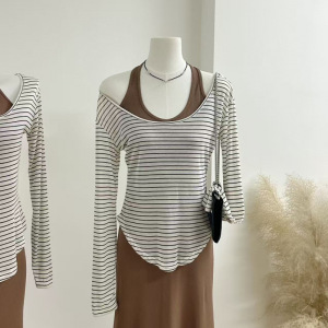 天丝羊毛 复古条纹长袖T恤收腰显瘦打底罩衫上衣女