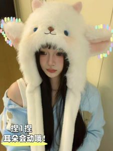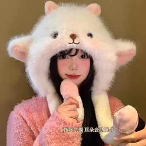小羊毛绒帽子耳朵会动女冬季可爱加厚保暖防寒护耳帽显脸小雷锋帽