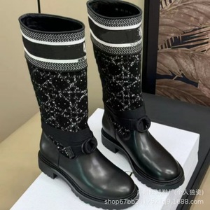高定 易梦玲同款长筒靴刺绣卡其色不过膝真皮复古拼色D家骑士靴女