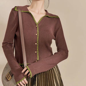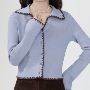 设计感拼接花边针织开衫秋季翻领修身显瘦百搭微喇叭袖上衣女蓝色