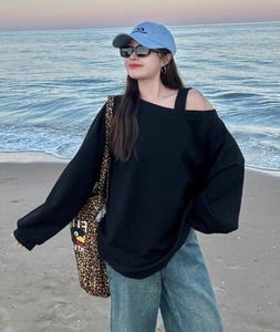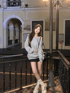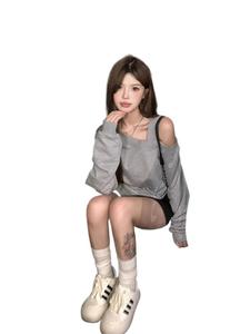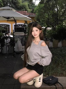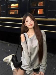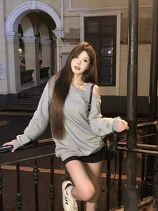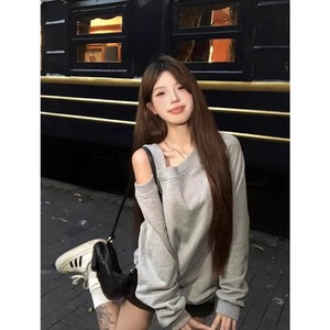 辣妹斜肩长袖卫衣女秋季2025新款设计感小众慵懒别致露肩纯色上衣