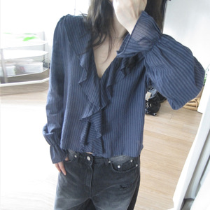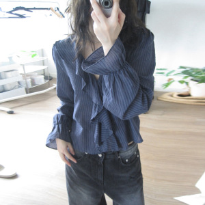 韩系ins条纹撞色荷叶边设计V领长袖T恤纯欲温柔宽松慵懒随性上衣