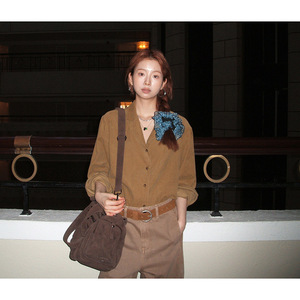 HelloooEat 复古黄灯芯绒衬衫秋季百搭戗驳领竖坑条长袖上衣外套