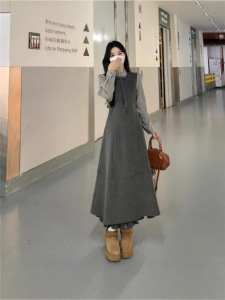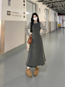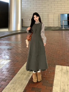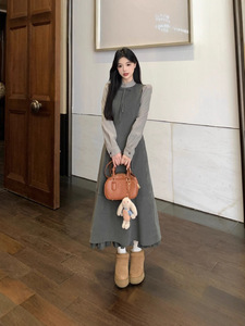 大码女装2025秋冬新款韩系假两件复古收腰显瘦高级感连衣裙
