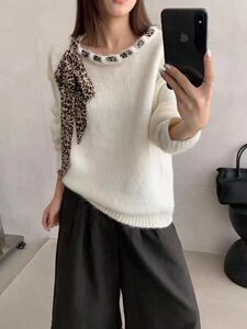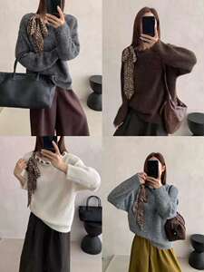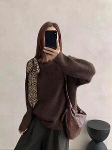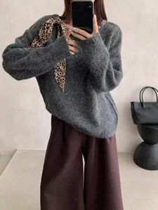 美式复古咖色豹纹斜肩毛衣女秋冬季设计感小众露肩宽松针织衫上衣