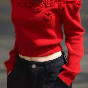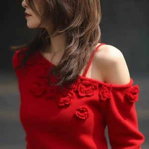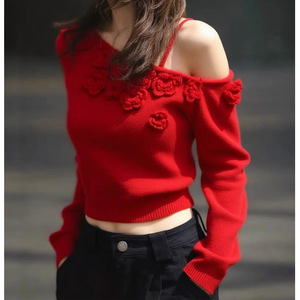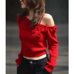 韩系氛围感早秋穿搭气质独特漂亮小众设计立体花朵红色斜肩针织衫