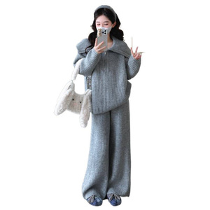 孕妇秋冬宽松软糯亲肤拉链时尚大翻领毛衣休闲款阔腿裤时尚套装