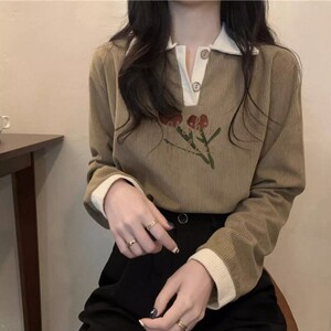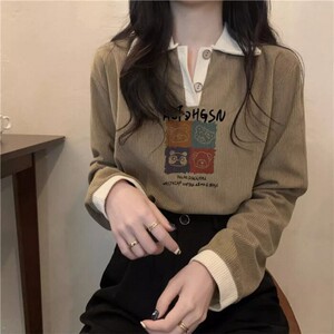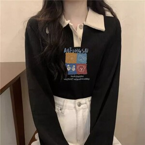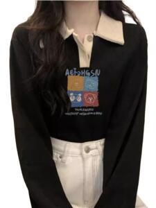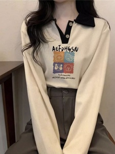 撞色polo领小熊印花长袖t恤打底衫女2025春秋新款宽松设计感上衣