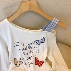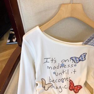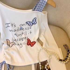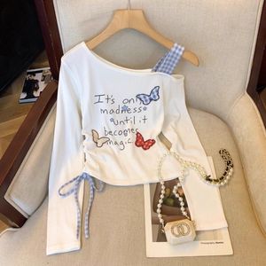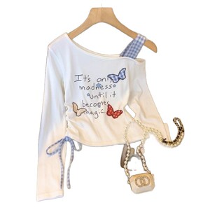 纯欲斜肩吊带长袖T恤女春秋抽绳收腰打底假两件辣妹小衫短款上衣