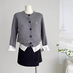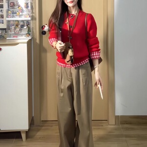 韩系假两件红色格子针织开衫女秋冬设计感拼接衬衫毛衣女外套上衣