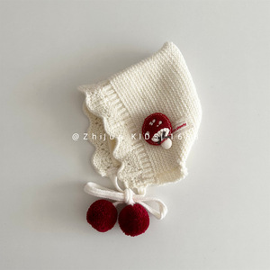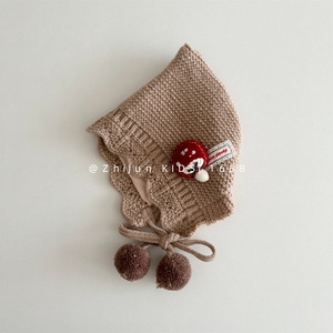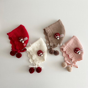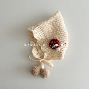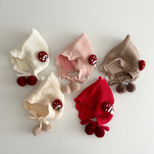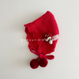 宝宝毛线帽可爱小红花洋气2025新款尖尖套头帽双球系带保暖护耳帽