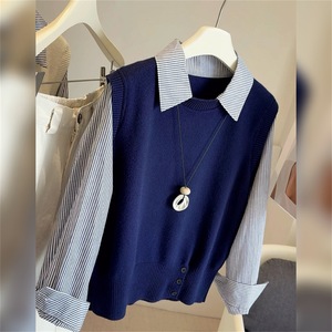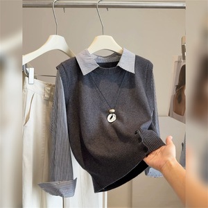 秋冬韩系针织衫假两件长袖女装套头衬衣袖拼接设计显瘦上衣