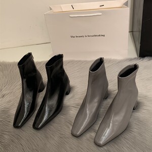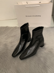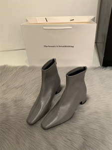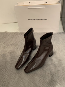 棕色粗跟短靴女秋冬新款感法式小踝靴高跟后拉链方头瘦瘦靴