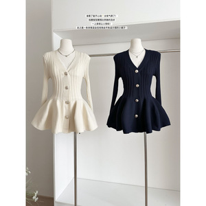 法式荷叶边V领收腰显瘦花苞裙上衣设计感针织开衫女中长款秋