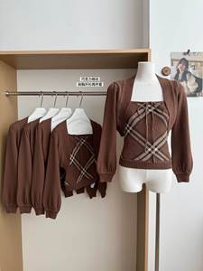 “复古昭和”棉针织巧克力格纹抹胸+开衫两件套上衣外套