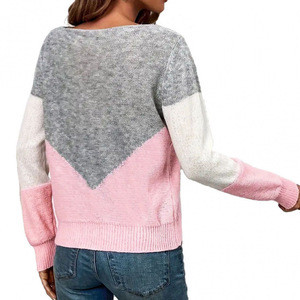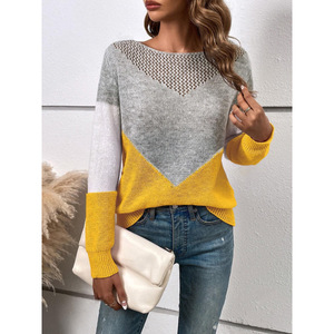 欧美跨境秋冬款撞色圆领套头毛衣外贸镂空拼色休闲女装上衣长袖衫