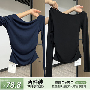 藏蓝色秋季露锁骨长袖恤女褶皱收腰一字领斜角露肩别致上衣