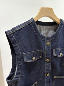 早秋新款~ 复古水洗深蓝色排扣小口袋装饰圆领短款百搭马甲/马夹