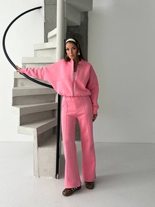 跨境亚马逊欧美热卖时尚女装短款休闲开衫外套抽绳口袋长裤两件套