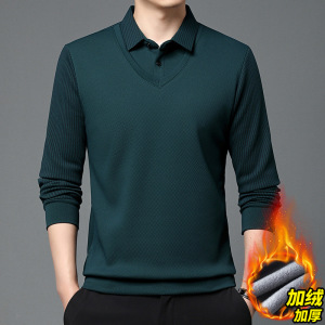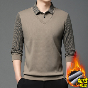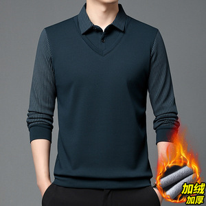 男士假两件Polo衫加绒加厚秋冬新款时尚休闲保暖翻领条纹长袖上衣