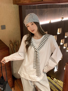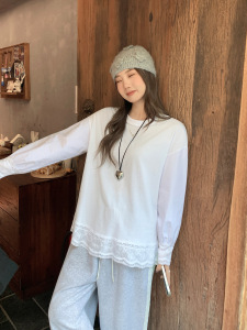 白色圆领蕾丝拼接宽松正肩长袖T恤女2025早秋新款打底衫内搭上衣