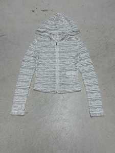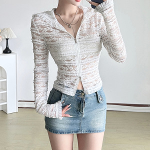 韩风新款立体条纹蕾丝设计拉链连帽开衫个性钩花小众时髦休闲外套