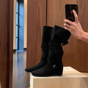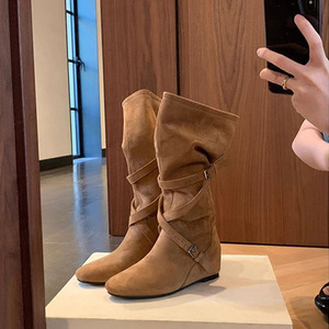 法式复古绒面靴子内增高西部靴女褶皱堆堆靴中筒扣带显瘦骑士靴女