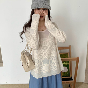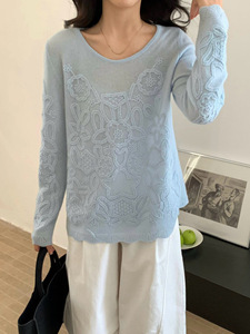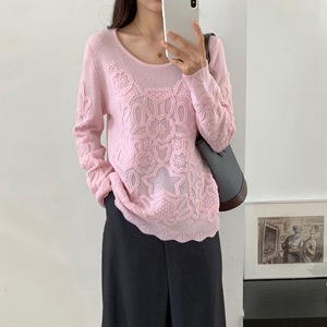 韩系早秋穿搭针织衫刺绣上衣女设计感套头宽松圆领长袖100%羊绒衫