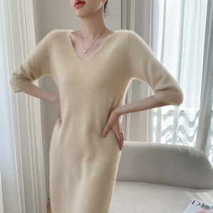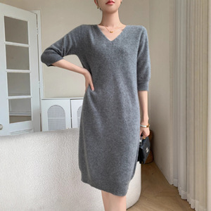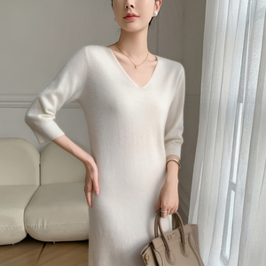 2025秋冬新V领套头中长款山羊绒衫女修身显瘦毛衣中袖针织连衣裙