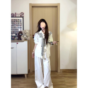 套装女2025秋季新款韩系辣妹条纹披肩长袖衬衫高腰阔腿裤三件套潮