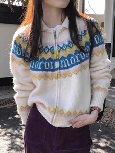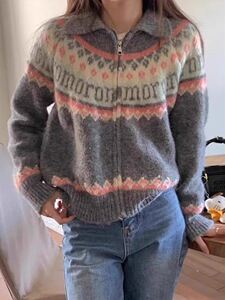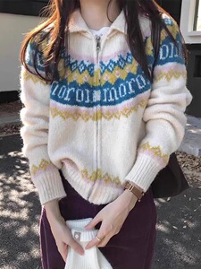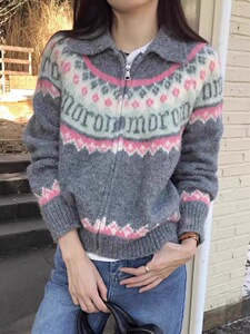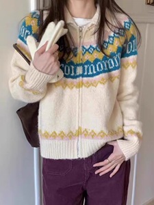 韩系风软糯撞色提花费尔岛毛衣外套女2025秋冬新款针织外搭开衫女