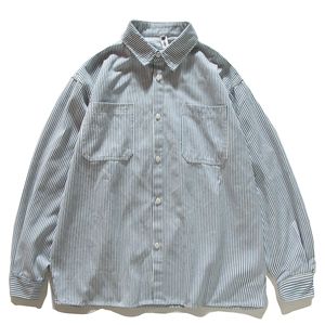 日系复古文艺青年条纹工装衬衫男女宽松纯棉长袖衬衣情侣休闲外套