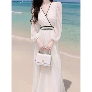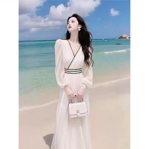 法式气质V领白色连衣裙女2025早秋新款超仙海边度假收腰显瘦长裙