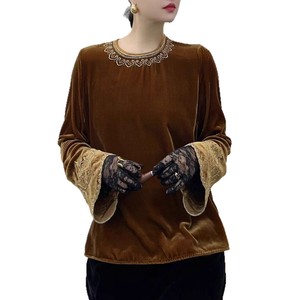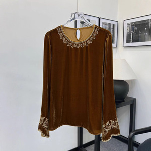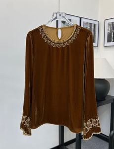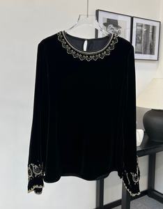 重工钉珠刺绣真丝丝绒上衣女早秋新中式国风宽松显瘦圆领长袖小衫