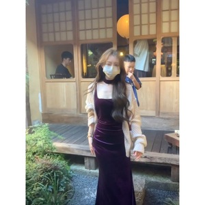 秋季风情万种紫色丝绒吊带连衣裙外搭针织开衫纯欲套装