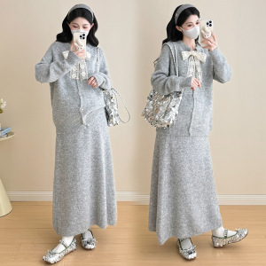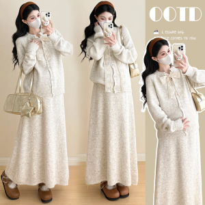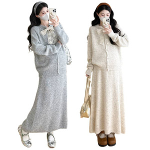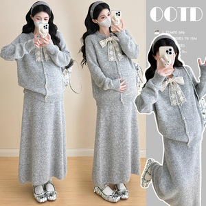 孕妇装秋冬韩版飘带气质款小香风毛衣针织半身裙甜美时尚孕妇套装