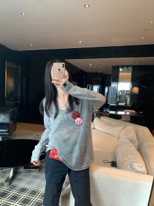 区区欧阳 V领羊毛针织衫女秋季慵懒风宽松复古打底衫宽松长袖上衣