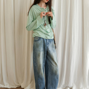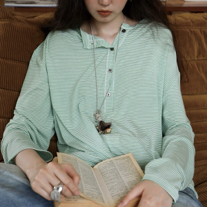 莱塞尔亲肤软糯丝滑绿白条纹松弛感堆褶亨利领针织长袖T恤