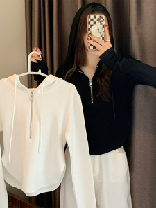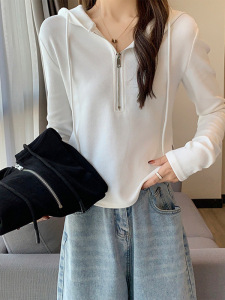 白色连帽长袖t恤女秋季小众独特别致设计感短款上衣内搭打底衫