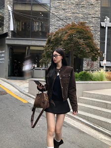 红人馆麂皮绒外套女秋季2025新款巨好看的冷淡系独特短款棕色上衣
