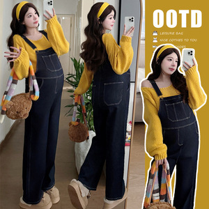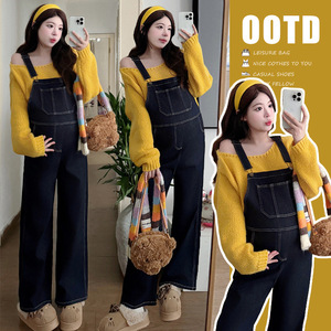 2025孕妇秋季新款孕妇装韩版休闲牛仔背带裤+毛衣套装