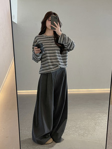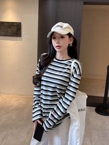 慵懒风chic春秋冬季打底衫2025美式条纹t恤女宽松中长款长袖上衣