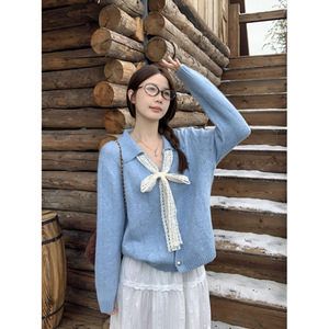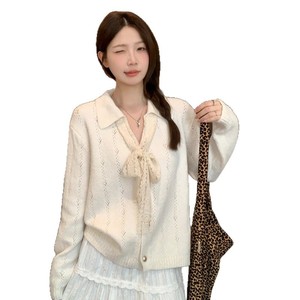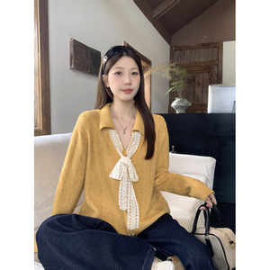 2025秋装新款大码胖MM温柔风V领系带蝴蝶结设计针织上衣