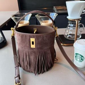 秋冬磨砂麂皮绒面流苏包2025新款洋气网红水桶包百搭单肩斜跨包