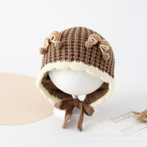婴儿帽子秋冬款花边毛线帽蝴蝶结保暖护耳帽女宝宝保暖加厚针织帽