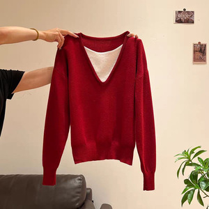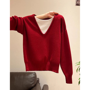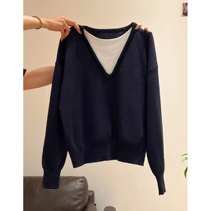毛衣纽扣假两件长袖针织开衫秋冬女装内搭修身气质高JI感打底上衣