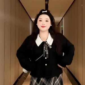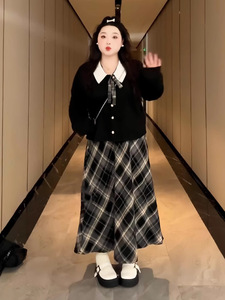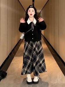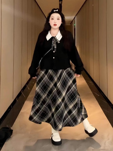 大码mm学院套装针织衫秋冬格纹半身裙两件套毛衣秋季显瘦清新韩版