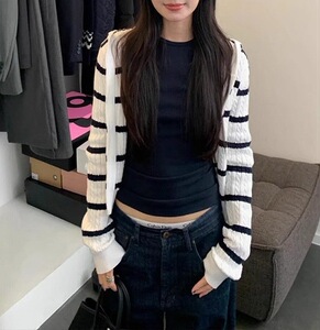 藏青色条纹连帽麻花针织开衫外套女韩系氛围感早秋季穿搭毛衣上衣