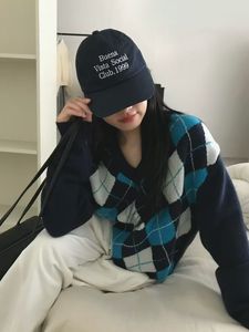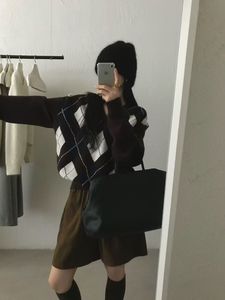 韩系复古菱格V领毛衣女秋冬百搭长袖套头针织衫时尚拼色叠穿毛衫