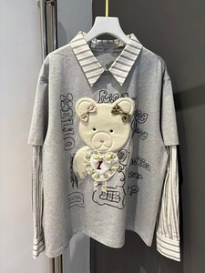 现货2025秋季新款高级感假两件打电话小熊涂鸦感贴布T恤长袖上衣